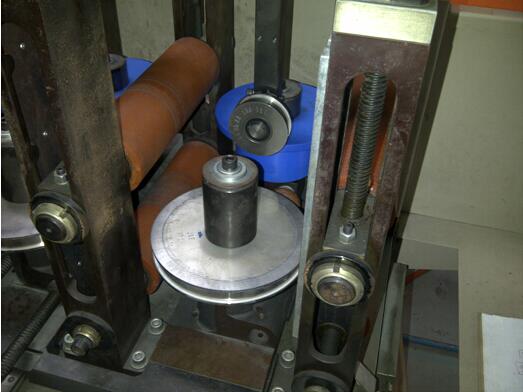在常规的滚压设备中,隔热铝型材左右两侧是滚压盘,上下边是定位胶轮。要做到90度滚压,就要将隔热铝型材左右两侧中的一侧的滚压盘换成定位胶轮,而上下边的定位胶轮中的上部胶轮要换成滚压盘,且因滚压设备的空间限制,该滚压盘必须经过特殊设计和处理(见图四)。这样使得两个滚压盘和定位胶轮都是成90度,从而达到90度滚压。