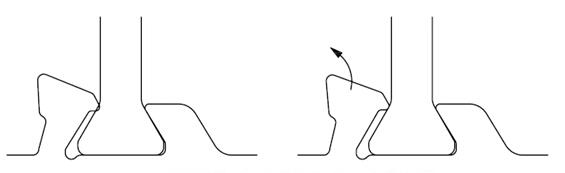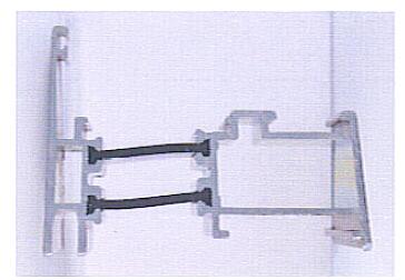 如选用常规隔热条进行先复合后表面处理工艺进行隔热型材加工,虽然在滚压后隔热型材有较高的纵向剪切力,但是在经过表面处理着道工序时,在约200℃的高温作用下,铝型材槽口的外夹头会因热胀冷缩的影响,导致外夹头松动,不能紧密咬合隔热条(如图5所示),从而使得隔热型材的纵向剪切力大副下降。