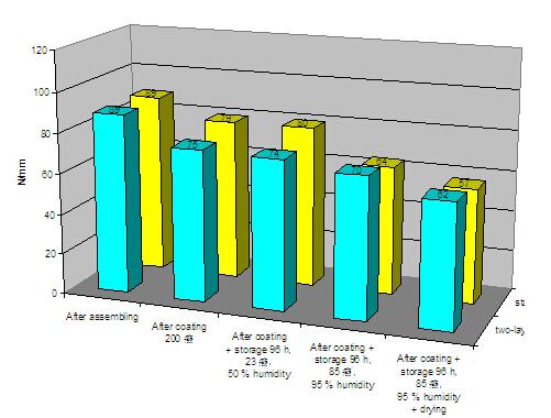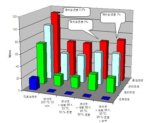 从图8可知,对于具有良好开齿的隔热型材,在复合完毕后,其纵向剪切力有89N/mm,经过表面处理后,其纵向剪切力有80N/mm了,剪切力损失仅10%。与使用常规隔热条的隔热型材,在表面处理完毕后,剪切离损失达以上对比,足以说明带热熔胶线的隔热条在先复合后表面处理工艺中对隔热型材的作用。