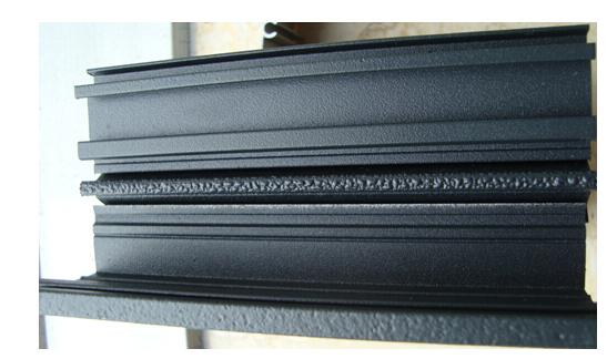 隔热条的主要材质是聚酰胺66加25%的玻璃纤维,聚酰胺66是一种可吸水材料,吸水饱和率在5%左右。如果隔热条内的水处于饱和状态,就进行表面处理,并去烘烤的话,会使得隔热条内的水分在烘烤过程中蒸发出来,造成隔热条表面出现大面积气泡(如图9所示)或隔热条断裂。