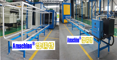 用于铝型材的喷涂和木纹转印。设备一侧为手工喷涂用,另一侧进木纹。共用一个烤箱。工艺流程为,先喷涂,然后进烤箱固化,然后在放到另一侧,套袋抽真空,再进烤箱进行转印。出来后就是带有仿真木纹的铝型材。
