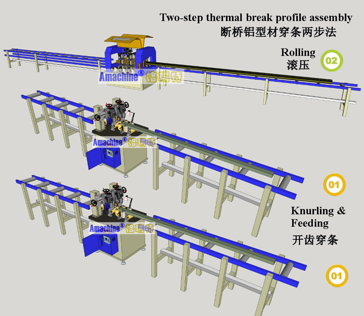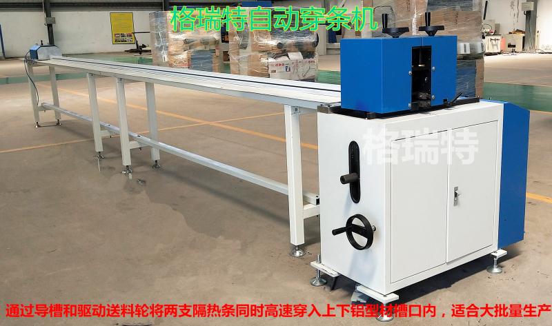 穿条机采用齿型滚轮准确地将隔热条穿入两根铝型材相应槽口内。
